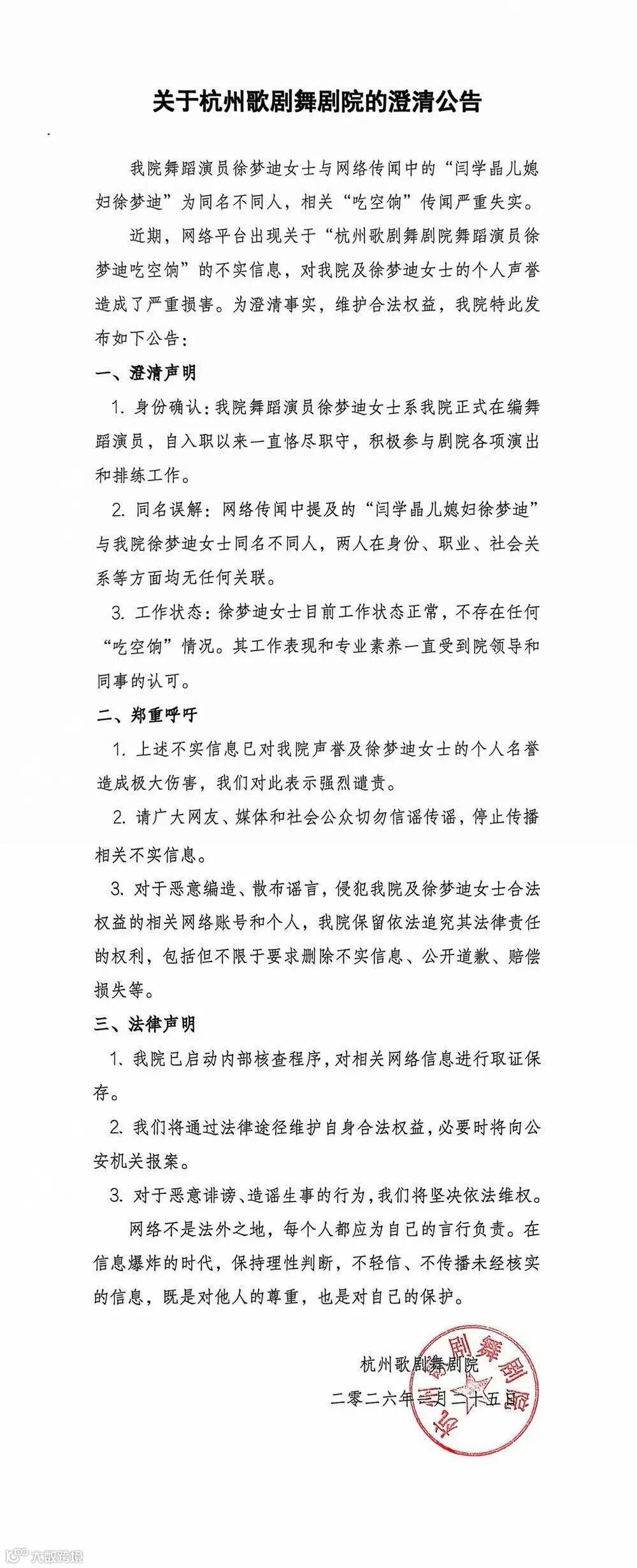 杭州歌剧舞剧院发布澄清公告:我院舞蹈演员徐梦迪女士与网络传闻中的“闫学晶儿媳妇徐梦迪”为同名不同人,相关“吃空饷”传闻严重失实。