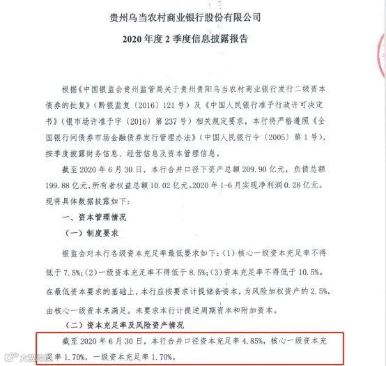 例如,此次评级下调的贵州乌当农商行,已经连续多年面临资本不足的问题。今年上半年,该行实现营业收入1.73亿,同比下降50.63%;净利润0.28亿,同比微增0.96%。合并口径下资本充足率4.85%;一级资本充足率1.7%;核心一级资本充足率1.7%。