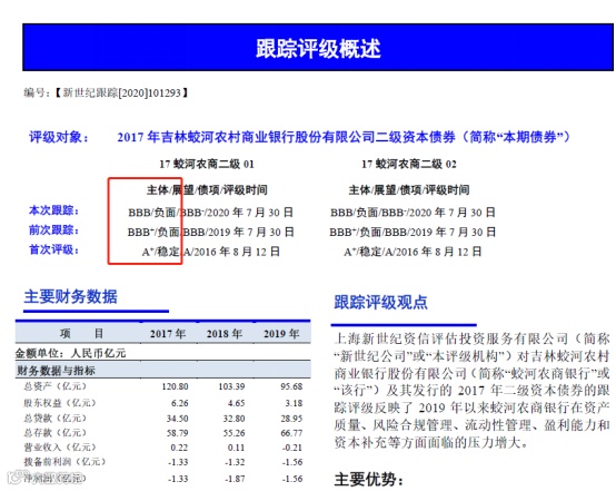 2018年7月31日,新世纪评级下调蛟河农商行主体信用评级,从A+变为A-,2019年7月30日,再次下调其主体信用评级为BBB+,今年7月30日,将其主体信用评级又下调为BBB,展望为“负面”。