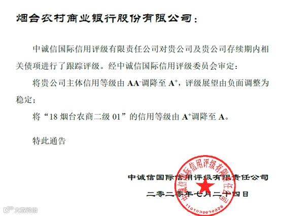山东的烟台农商行也在评级下调之列。7月24日,中诚信国际信用评级有限责任公司发布2020年烟台农商行跟踪评级报告,将其主体信用等级由AA-调降至A+,评级展望由负面调整为稳定。