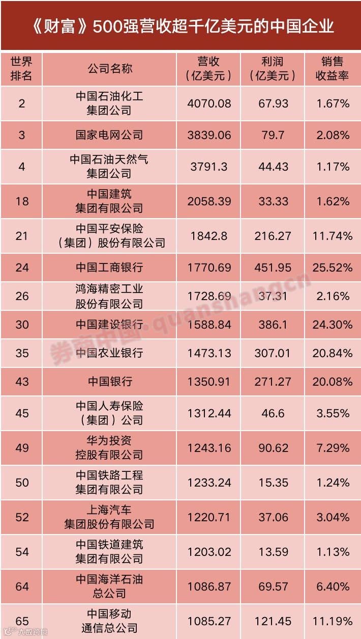 据券商中国记者统计,今年榜单上营收超过1000亿美元的世界500强公司中,中国企业有17家。其中有6家金融企业,为中国平安、工商银行、农业银行、中国银行、建设银行以及中国人寿;4家能源企业,分别为中石化、国家电网、中石油、中海油;3家建筑施工企业,为中国建筑、中国铁路工程集团、中国铁道建筑集团;2家高科技制造业,即华为、鸿海精密。此外还有上汽集团、中国移动两家公司。
