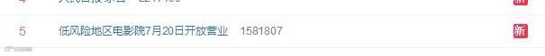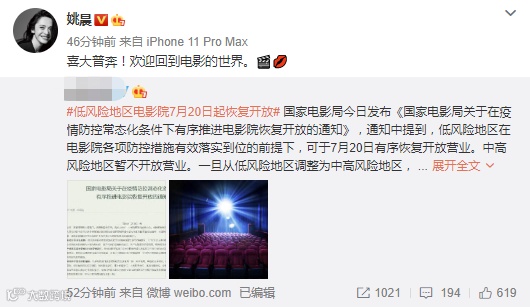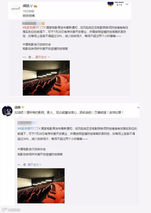 16日,国家电影局发布通知,在电影院各项防控措施有效落实到位的前提下,低风险地区可于7月20日有序恢复开放营业。