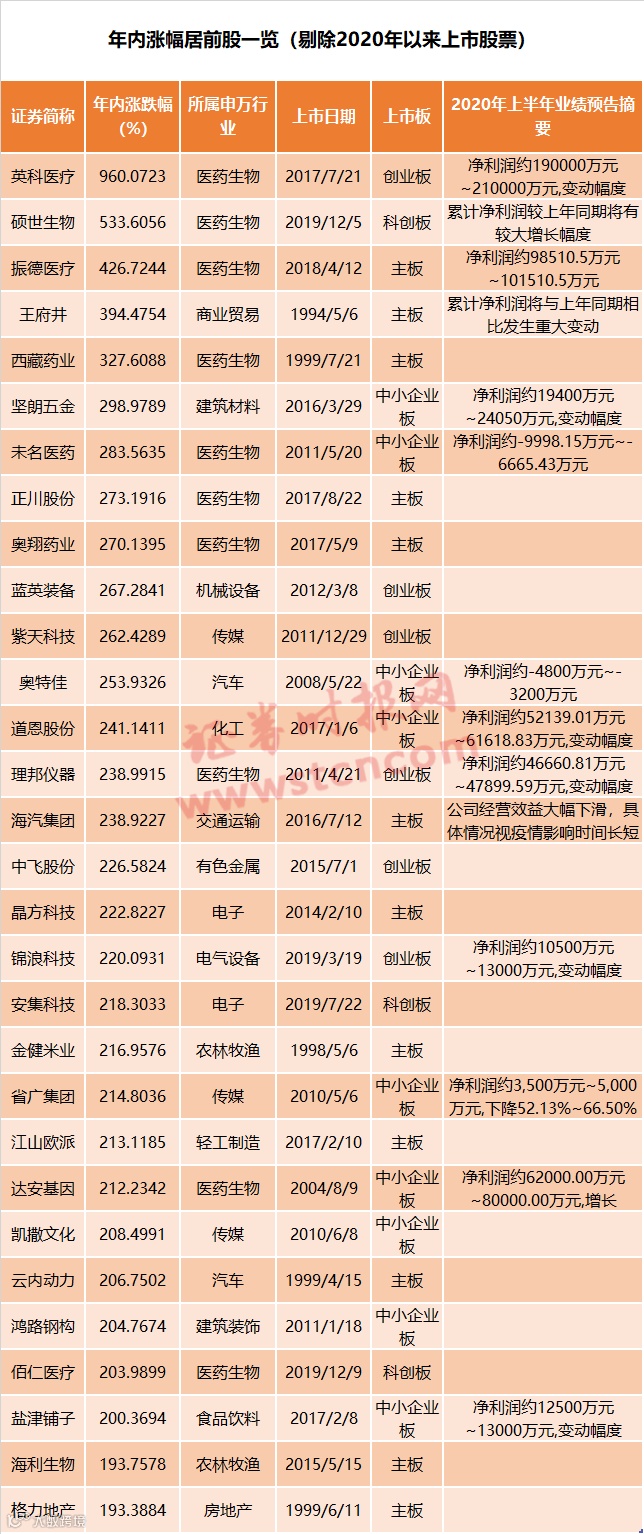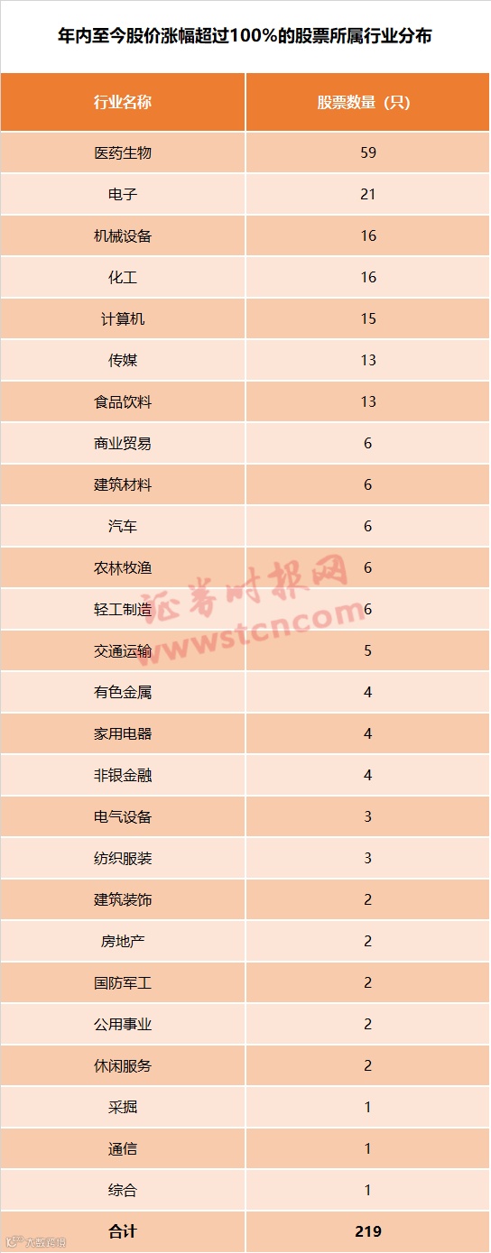 据记者统计,在剔除2020年以来上市的股票后,年内至今股价翻倍的股票达219只。