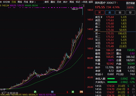 行情数据显示,在市场出现调整之际, 今年股价已翻了数倍的英科医疗继续上涨,盘中股价一度达到184.37元,较去年底股价上涨超过10倍。