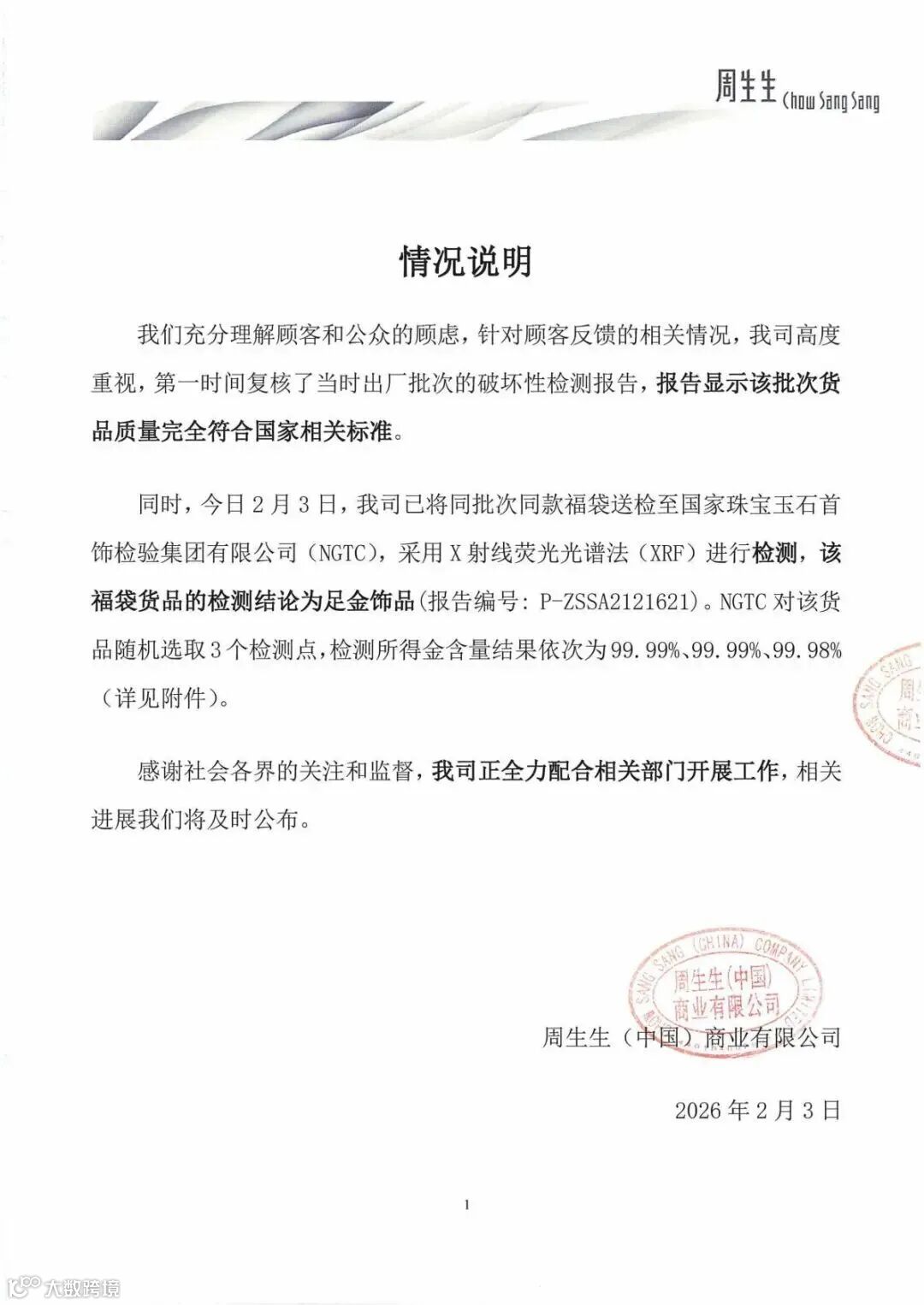 周生生官方微博2月3日发布情况说明称,高度重视顾客反映的相关事宜,正积极开展相关工作。