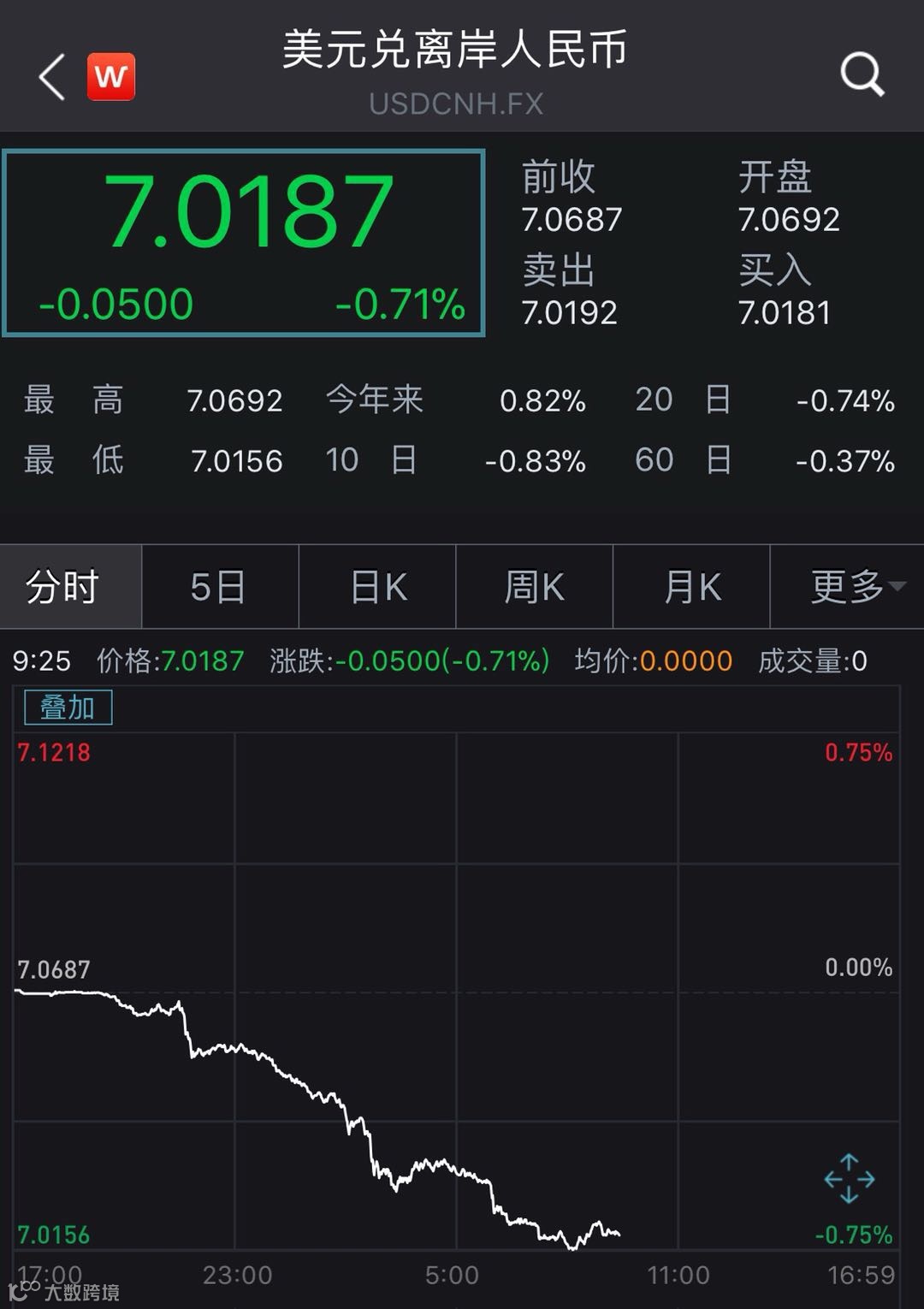 在岸和离岸人民币兑美元汇率盘中一度双双收复7.03。截至21:30,离岸汇率更是升破7.02,一度涨超500点,随后回落至7.0187。