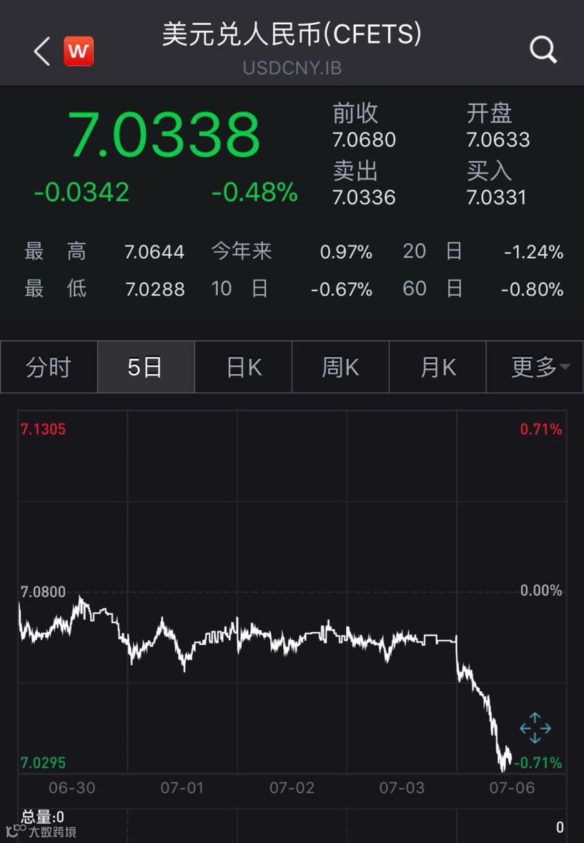 7月6日,人民币兑美元汇率出现一波凌厉涨势,在岸人民币一度升破7.03,最高达到7.0288。实际上,自上周以来,人民币汇率就在稳步回升。在岸人民币汇率连续五个交易日上涨近0.7%,且尤以7月6日涨幅最为明显。
