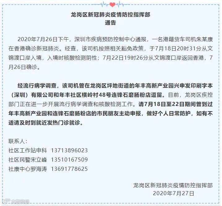 龙岗发布27日中午发布消息,龙岗区新冠肺炎疫情防控指挥部通告称,2020年7月26日下午,深圳市疾病预防控制中心通报,一名港籍货车司机朱某康在香港确诊新冠肺炎。经查,该司机按照相关豁免政策,于7月18日20时31分从文锦渡口岸入境,入境时核酸检测阴性;7月22日19时26分从文锦渡口岸返回香港,7月26日确诊。
