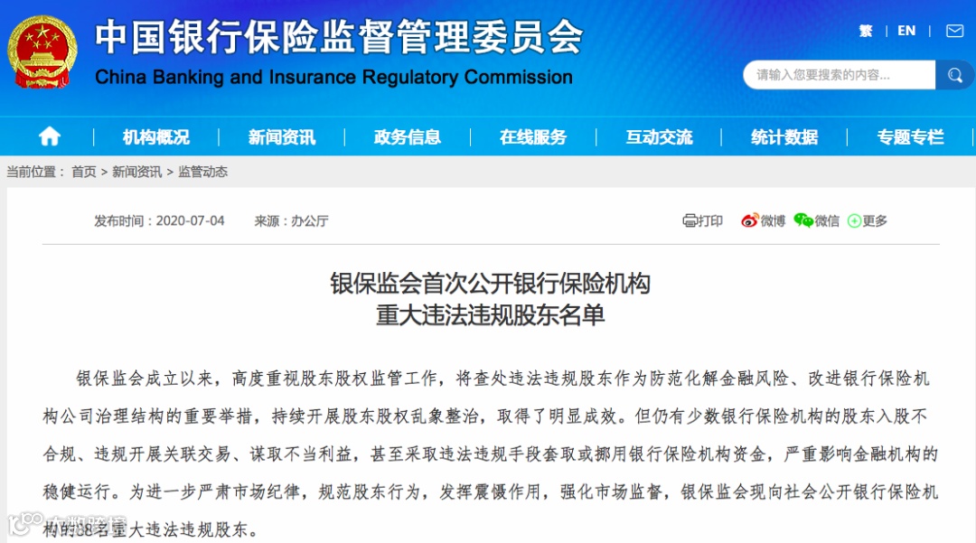 银保监会7月4日曾表示,下一步,其将进一步完善公开方式,加大公开力度,建立公开重大违法违规股东的常态化机制。