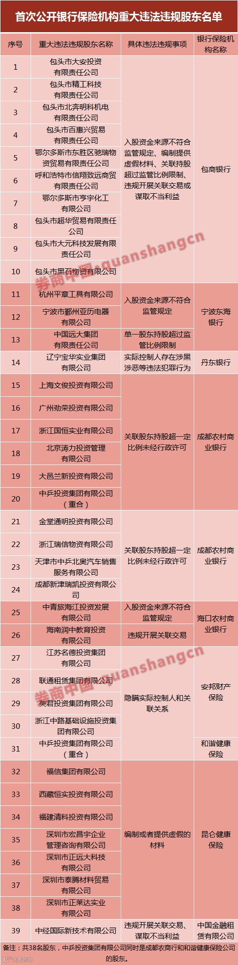 这38家上了银保监会“黑名单”的重大违法违规股东,都入股了哪些银行保险机构?分别有何重大违法违规行为?券商中国记者从业界获悉了相关情况。
