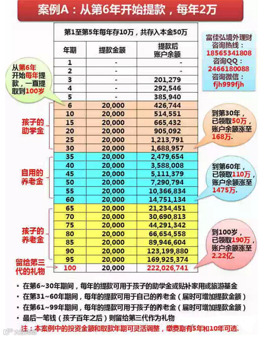 假设孩子为0岁,在案例A中(详见下图),从第6年开始每年提款20000元直至孩子100岁,共领取了95年合计190万元,此时账户余额仍高达2亿2200万!秒杀国内一切理财产品!