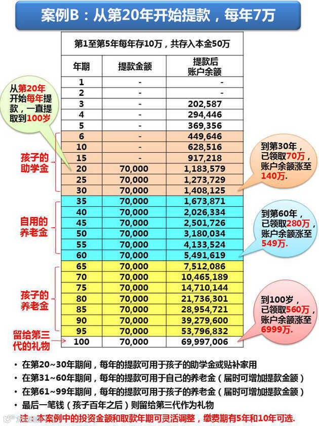 案例B: 5年共投入本金50万元,从第20年开始每年取款7万元直至100岁