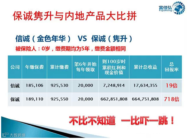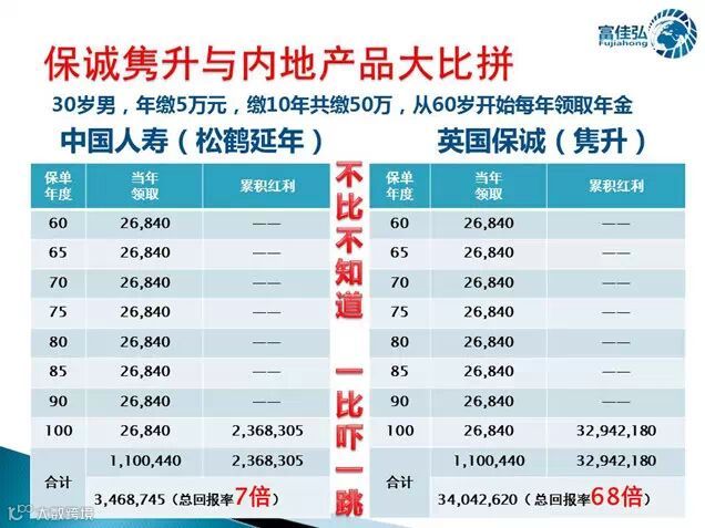 从以上对比可以看到,在同样的被保人、同样缴费条件下,隽升的高收益令内地同类产品望尘莫及,真可谓:不比不知道、一比吓一跳!