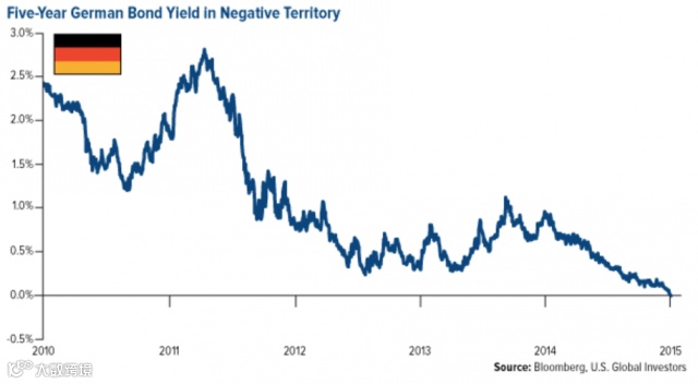 德国5年期和10年期债券收益率已经跌破0,清楚的显示出欧元区的通缩。这意味着德国的债券持有人正在付费持有德国债券。不少欧元区的投资者将目光转向国际市场。(黄金、美国市政债等)。