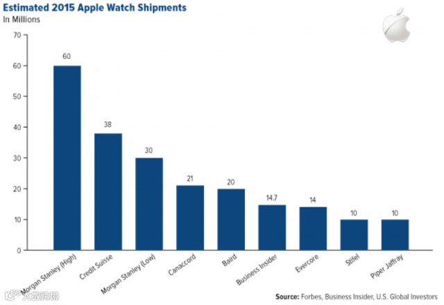 苹果的Apple Watch即将上市,这是否会将股价拉高?下图显示了华尔街对于苹果Apple Watch 2015年出货量的预期。