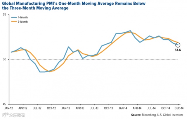 自去年9月以来,全球的一个月PMI数据均低于3月移动平均线。