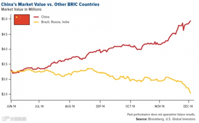 A股自去年进入牛市,而中国经济却在放缓。目前,中国股市的估值依然较低。过去6个月来,A股的市值超越了巴西、俄罗斯和印度股市市值的综合。