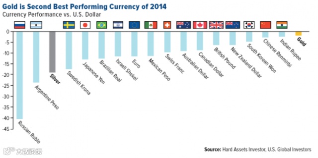 尽管去年黄金价格下跌了1.7%,但它依然表现好于除美元以外的全部货币。2015年,黄金或许是一个非常有吸引力的货币。