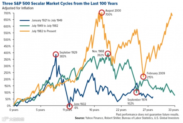 市场30年一个周期,我们已经接近这个30年的尾声。在对通胀进行调整后,此前三个大周期的经济持续上升。1921-1949年,1949-1982年和1982-2015年。下一个周期是否能依然保持现在通胀调整后的上涨势头?