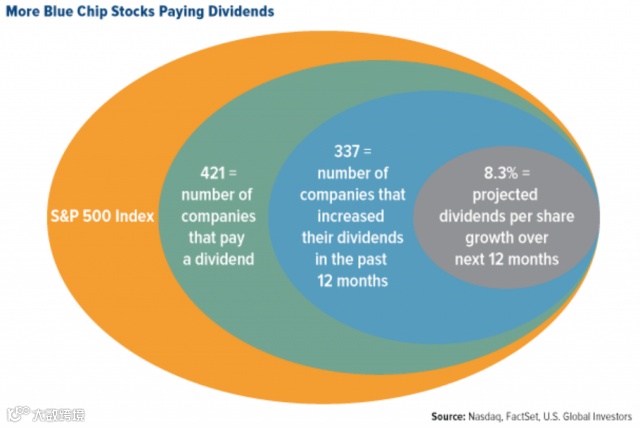 2014年,85%的标普500指数成分股公司定期向投资者支付股息。Factset分析师预计,每股股息将在接下来12个月中上涨8%,其中金融板块以及消费品板块的股息预计将有两位数的增长。