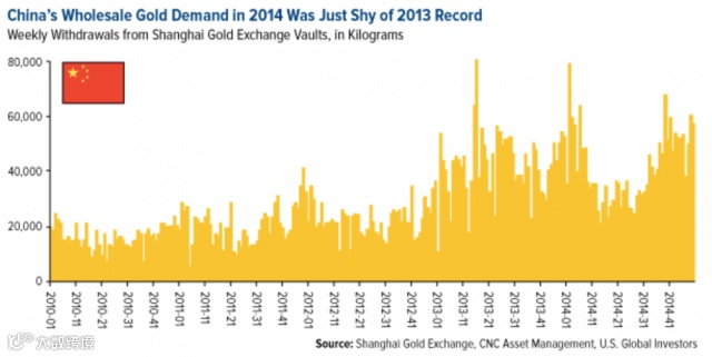在中国,虽然经济放缓,但黄金批发需求一直保持稳定。2014年上海黄金交易所的提货量仅略低于2013年创下的记录。
