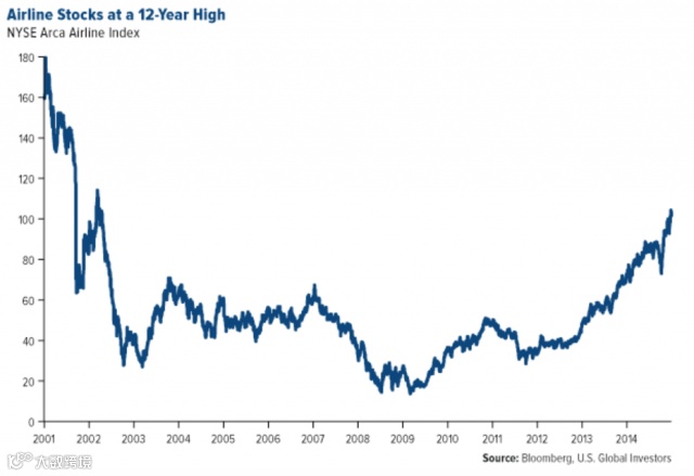 更低的能源价格无疑使得开采和生产石油的公司蒙受了损失,然而,更低的能源价格利好了许多能源消耗型的公司,比如航空公司。尽管受到了埃博拉等因素的影响,航空股持续上涨。