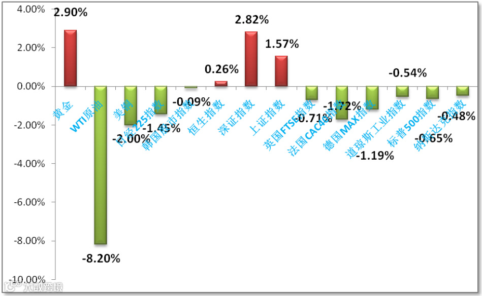 市场走势:欧美日股市延续下跌,中国股市上涨,石油继续大跌,黄金大涨。