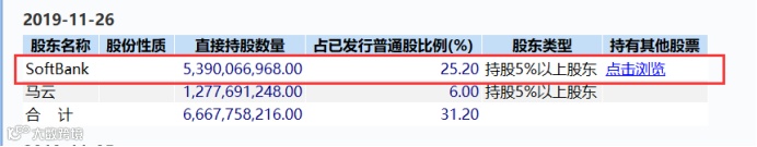 2016年,软银开始减持阿里,尽管多次减持,阿里的股票目前依然是软银持有的价值最高的资产。Wind统计数据显示,截至2019年11月26日,软银仍然持有25.2%的阿里巴巴股份,以目前阿里巴巴6068.86亿美元市值计算,软银持有阿里巴巴股份超1500亿美元,超过目前软银总市值。Wind统计数据显示,截至6月24日,软银在东京交易所的收盘价5396日元,总市值约1060亿美元。