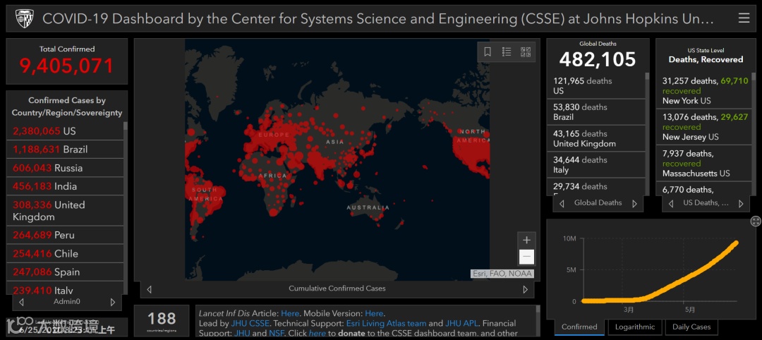 据美国约翰斯·霍普金斯大学发布的实时统计数据显示,截至北京时间6月25日8时23分左右,全球累计确诊新冠肺炎病例超940万,达9405071例,累计死亡482105例。