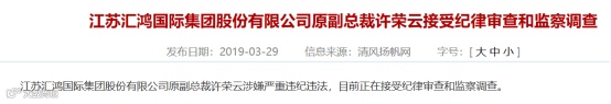 直到6月24日晚上,在江苏省纪委监委宣布张剑涉嫌严重违纪违法接受纪律审查和监察调查后,汇鸿集团也发布关于董事长接受调查的公告,并表示目前公司生产经营一切正常,将尽快召开董事会会议推举一名董事代行董事长职务,代行法定代表人职责。