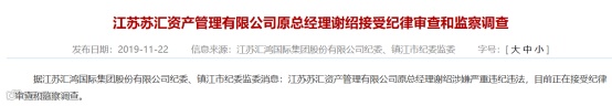 江苏苏汇资产管理有限公司原总经理谢绍涉嫌严重违纪违法,目前正在接受纪律审查和监察调查。他从2010年起在汇鸿集团任职,2019年6月,被免去江苏苏汇资产管理有限公司总经理、汇鸿集团外经有限公司董事长职务。