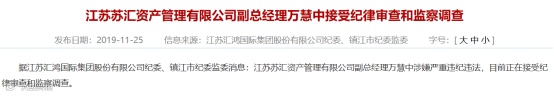 江苏苏汇资产管理有限公司副总经理万慧中接受纪律审查和监察调查。他在2018年曾任汇鸿集团中鼎控股股份有限公司董事长、党委书记。