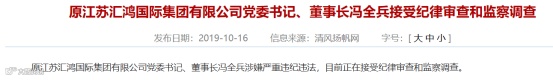 原汇鸿集团党委书记、董事长冯全兵涉嫌严重违纪违法,接受纪律审查和监察调查。他从2004年11月起担任汇鸿集团党委书记、董事长,2013年3月被免去相关职务,此后在2015年3月退休。