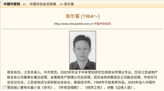 当时的报道同时显示,除了是国企掌门人,张剑还有另一重身份:作家。他在2005年加入中国作家协会,著有长篇小说《非鸟》《听老鼠唱歌》《纯然之色》《欲望的边界》,诗集《边缘人语》《时间与花朵》,并多次荣获全国性诗歌大奖。e公司记住注意到,张剑的笔名为“张尔客”。