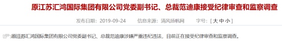 原江苏汇鸿国际集团有限公司党委副书记、总裁范迪康涉嫌严重违纪违法接受纪律审查和监察调查。
