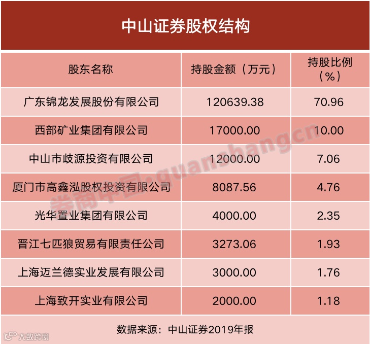 根据2019年年报,中山证券股权结构比较集中。锦龙股份持股比例达到70.96%;二股东西部矿业持股比例10%;厦门高鑫泓股权投资有限公司持股4.76%;光华置业持股2.35%。晋江七匹狼、上海迈兰德、上海致开的持股比例均低于2%。