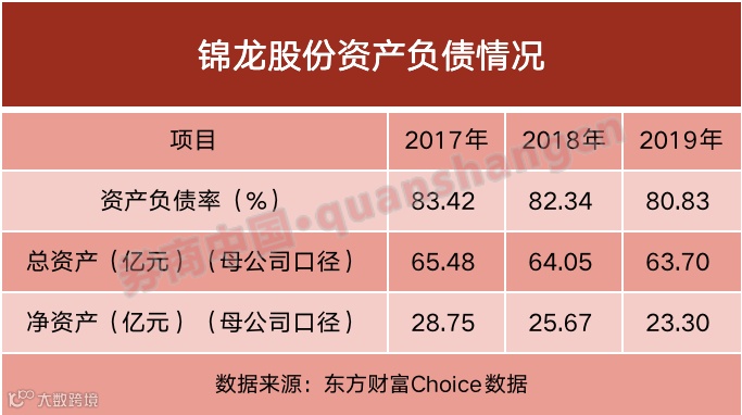 资产负债率持续高企。根据东方财富Choice数据统计,锦龙股份2017-2019年的资产负债率在80%以上。母公司口径下,锦龙股份总资产与净资产持续下滑,2019年分别为63.7亿元、23.3亿。