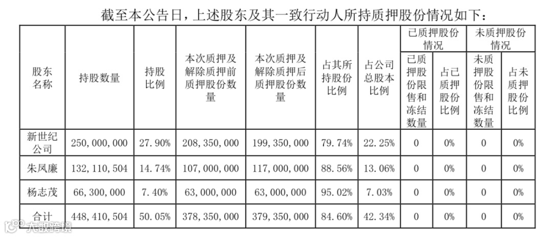 回到正题,财务紧张除了呈现在上市公司,锦龙股份股东也有显露,这一点从其股东持续做股票质押可见一斑。锦龙股份控股股东及其一致行动人大比例质押所持有的锦龙股份股权:截至今年6月24日,控股股东新世纪公司质押比例高达79.74%;董事长朱凤廉质押比例达到88.56%;实际控制人杨志茂高达95.02%。