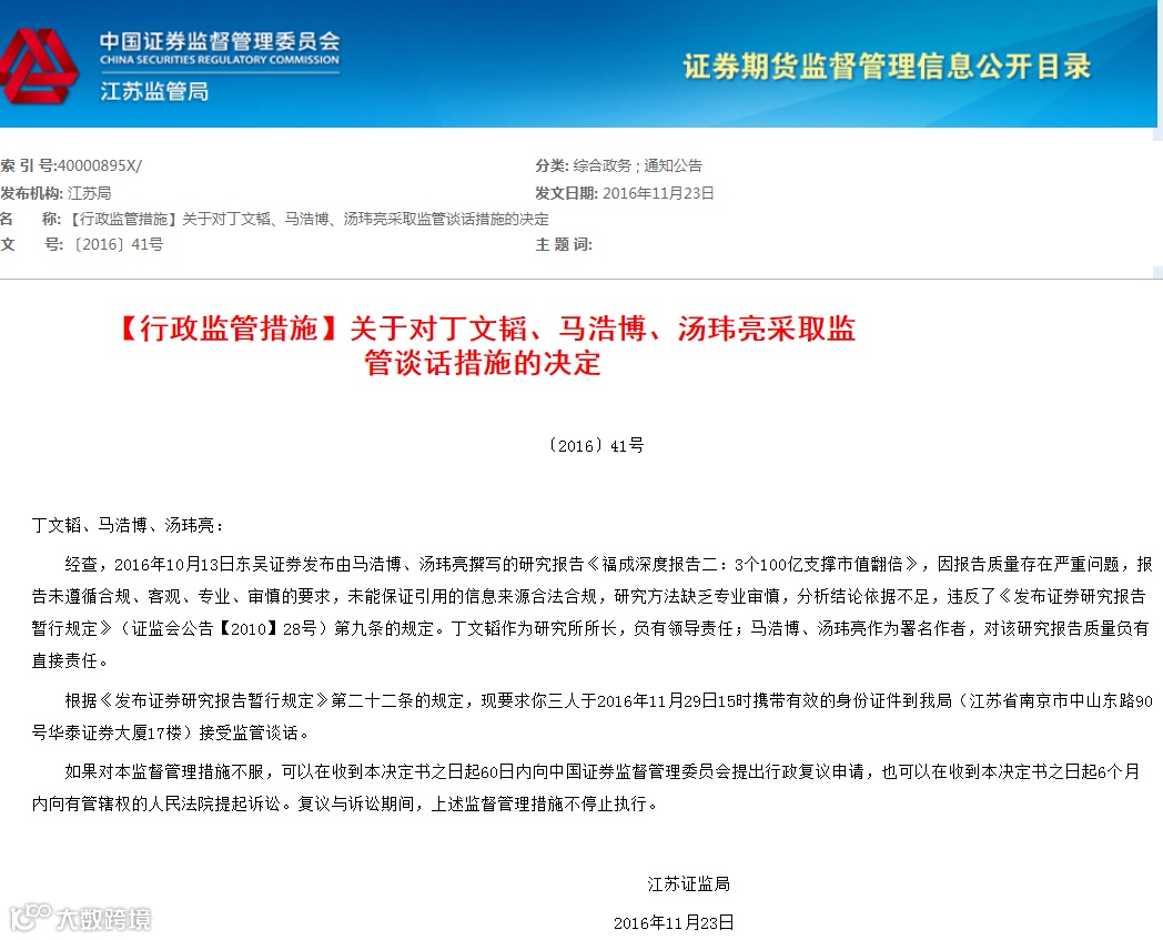 与此同时,丁文韬作为东吴证券时任研究所所长,负有领导责任;马浩博、汤玮亮作为署名作者,对该研究报告质量负有直接责任。故要求三人于2016年11月29日15时携带有效的身份证件到江苏证监局接受监管谈话。