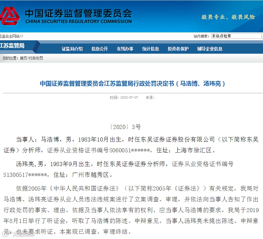 日前,江苏证监局公布一则行政处罚决定书,2016年的一篇失实研报,时任东吴证券分析师马浩博、汤玮亮分别被处以15万元和5万元的罚款。