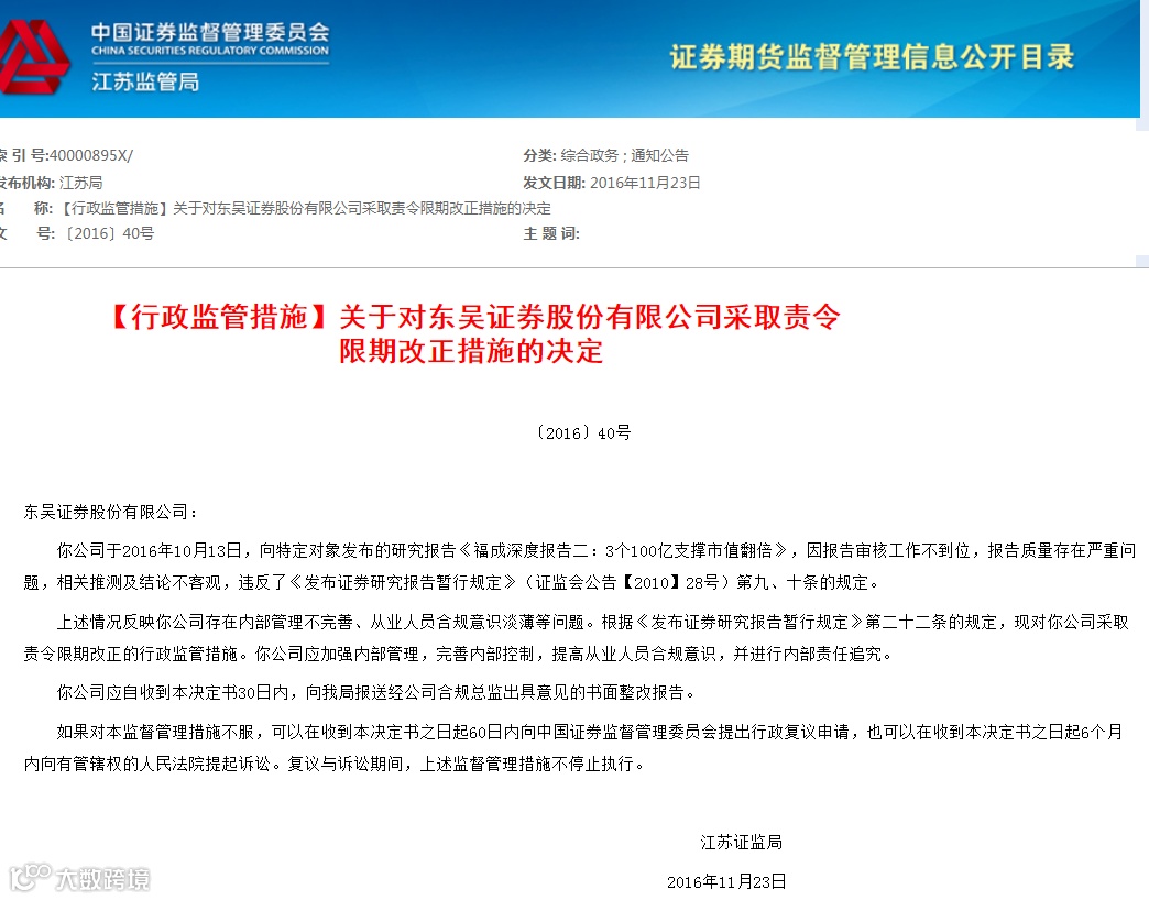 江苏证监局认为,东吴证券因报告审核工作不到位,报告质量存在严重问题,相关推测及结论不客观,违反了《发布证券研究报告暂行规定》,反应了该公司存在内部管理不完善、从业人员合规意识淡薄等问题。