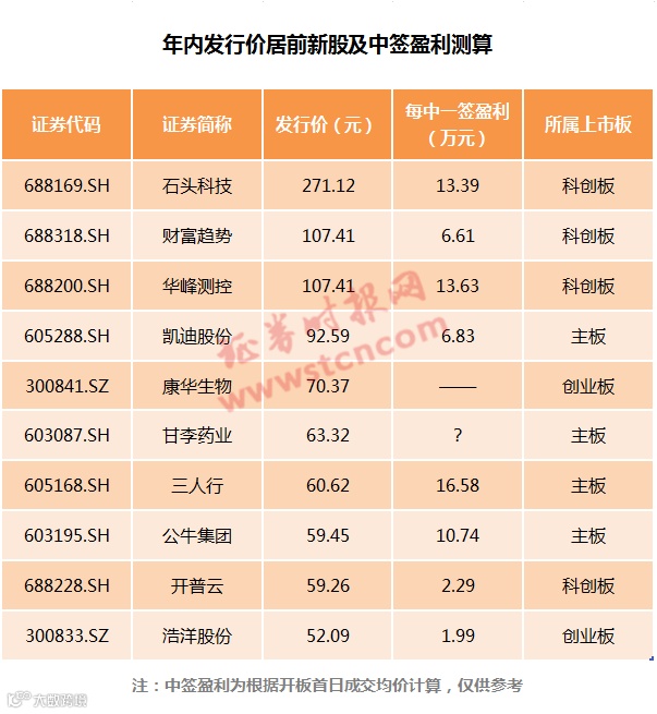 比如年内发行价最高的3只新股均为科创板新股,其中石头科技、华峰测控中一签盈利均超过10万元,财富趋势的中签盈利也超过6万元。