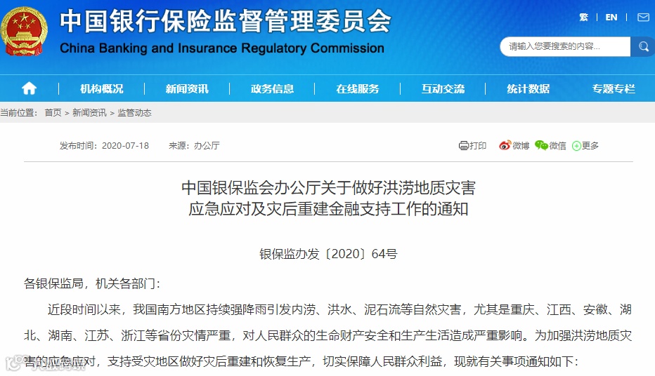 为加强洪涝地质灾害的应急应对,支持受灾地区做好灾后重建和恢复生产,切实保障人民群众利益,银保监会7月18日发布《关于做好洪涝地质灾害应急应对及灾后重建金融支持工作的通知》,明确进一步加大灾区信贷支持和保险保障力度,包括积极帮扶遇困小微企业、个体工商户,加大对普惠金融领域内的资源倾斜等。