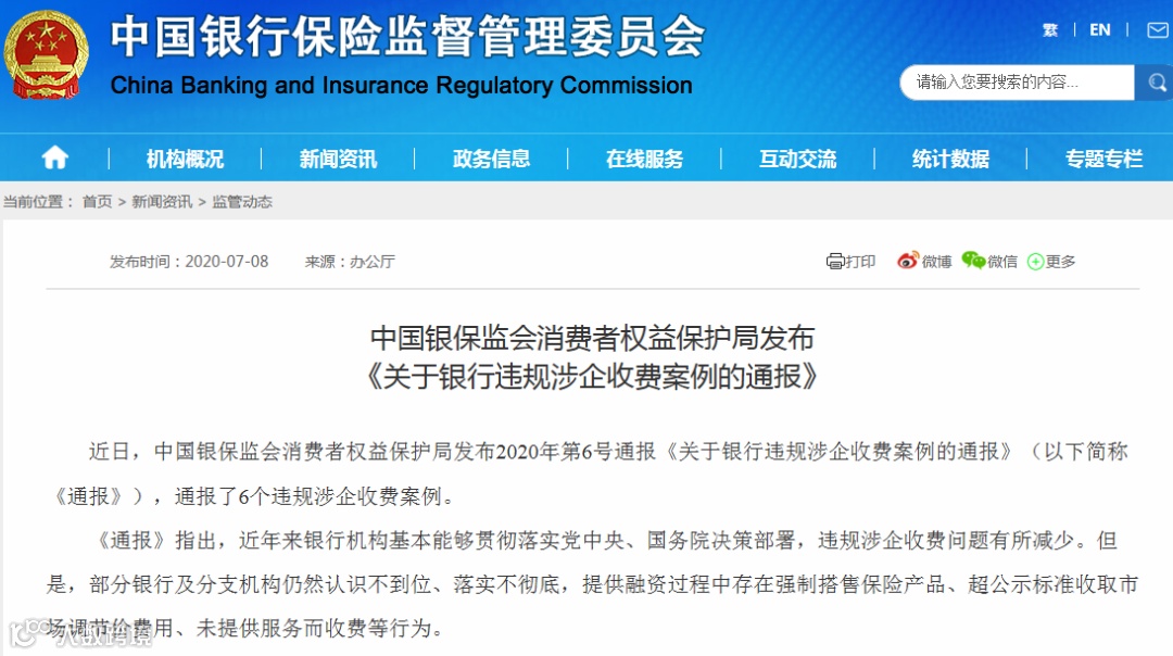 7月8日,银保监会消费者权益保护局通报《关于银行违规涉企收费案例的通报》(以下简称《通报》),通报了6个违规涉企收费案例,涉及银行向企业提供融资过程中存在强制搭售保险产品、超公示标准收取市场调节价费用、未提供服务而收费等违规行为。6个违规收费案例涉及5家银行,分别是农业发展银行、农业银行、浦东发展银行、大连银行和北京农商银行。