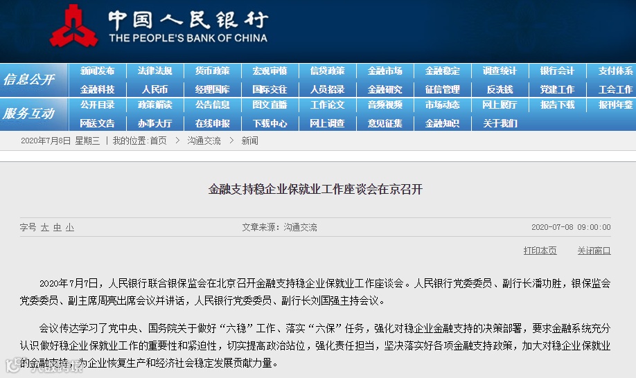 金融与实体共生共荣,今年银行业要为助力经济实现“六保”、“六稳”加大对实体经济的支持和让利力度。7月8日,央行官网披露,近日,央行联合银保监会在京召开金融支持稳企业保就业工作座谈会,这场会议“阵容”强大,央行两位副行长潘功胜、刘国强,银保监会副主席周亮出席,工商银行、建设银行、邮储银行、招商银行、民生银行行长分别介绍了金融支持稳企业保就业的主要做法,在京全国性银行业金融机构的主要负责人也参加了会议。