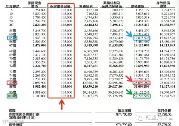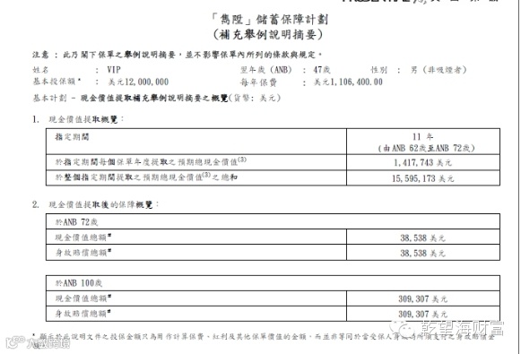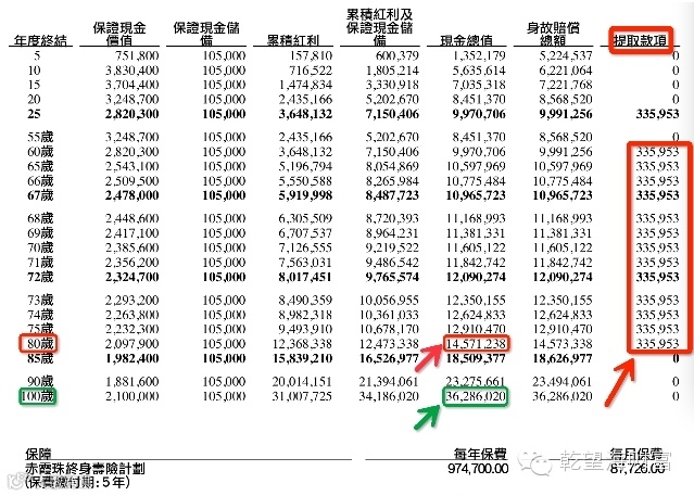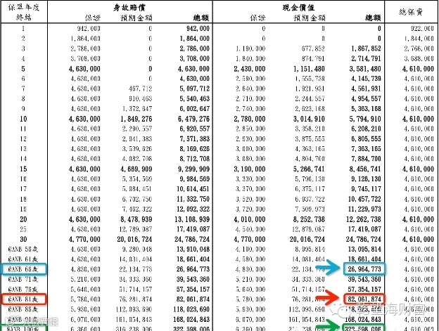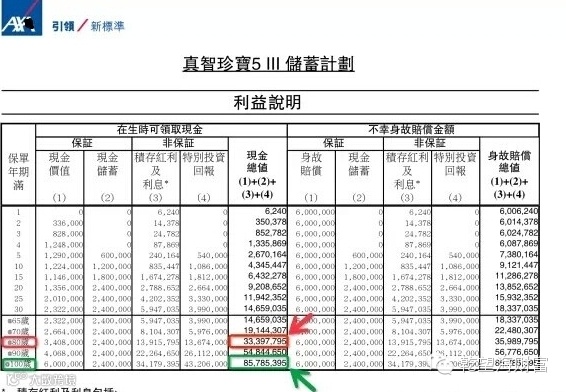 若客戶中途沒有作出提领金额,65岁退保可以一次领取26,964,773;80岁退保可以一次领取HKD82,061,874;100岁满期金可以领取HKD322,598,006