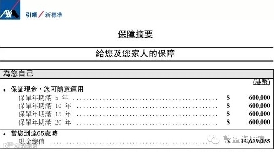 AXX安X: 于保单第5、10、15、20年(合共四年)保证每一次将获得保额10%(HKD600,000),此笔费用可以累积滚利、抵交保费或者领取使用。