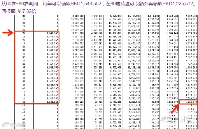 从60岁~80岁期间,每年可以领取HKD335,953,在80歲時還可以額外再領取HKD14,571,238。
