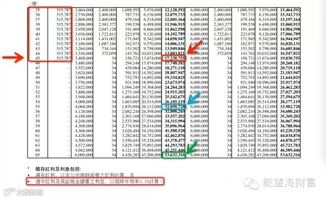 若客戶中途沒有作出提领金额,65岁退保可以一次领取14,659,035;80岁退保可以一次领取HKD33,397,795;100岁满期金可以领取HKD85,785,395。