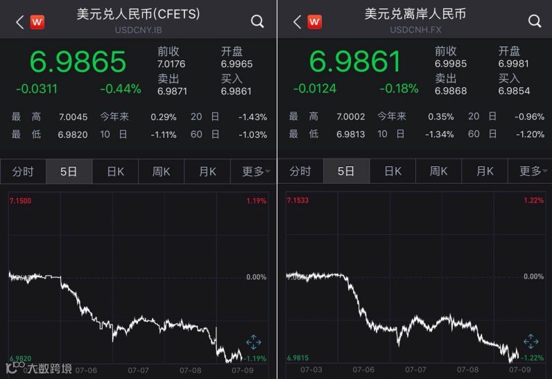 7月9日,在岸和离岸人民币兑美元汇率均升破7关口,重回“6时代”。截至16:30,在岸人民币兑美元收盘报6.9862,较上一交易日上涨314点;离岸人民币兑美元汇率同样大涨超100点达到6.986附近。